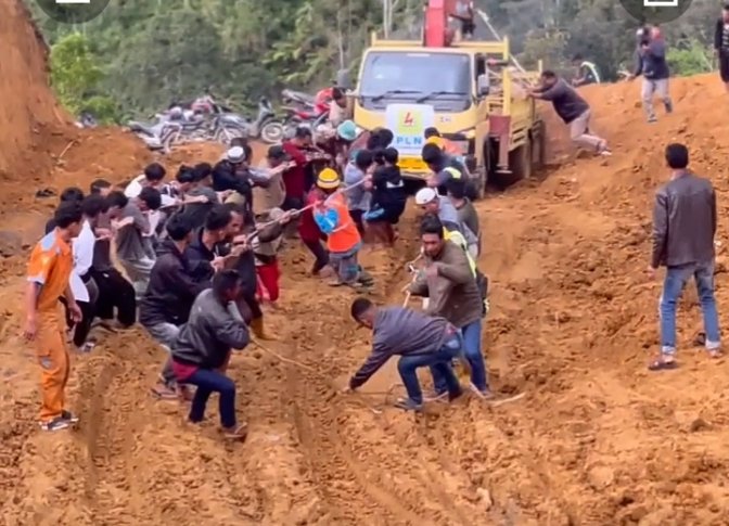 Peristiwa tersebut terekam dalam sebuah video yang beredar pada Minggu (28/12/2025). Dalam rekaman itu, tampak lebih dari 50 warga ikut menarik truk PLN yang mengangkut perlengkapan perbaikan jaringan listrik. Kendaraan tersebut harus melewati jalan tanah yang licin dan tertutup sisa material longsor.