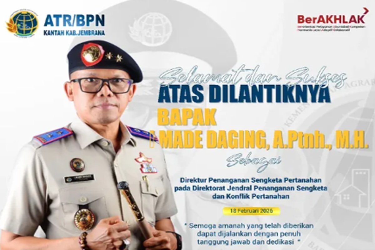 Jakarta – Kepala Kantor Wilayah Badan Pertanahan Nasional (BPN) Provinsi Bali, I Made Daging, memperoleh penugasan baru di tingkat pusat. Ia dipercaya menduduki jabatan Direktur Penanganan Sengketa Pertanahan di BPN RI dengan lingkup kerja nasional.