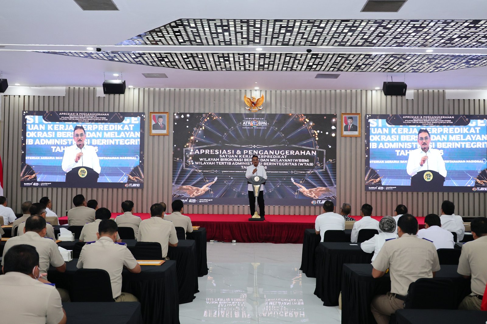 “Saya menyampaikan apresiasi dan penghargaan ini kepada seluruh Satker yang hari ini meraih predikat WBBM dan WTAB. Satker ini menunjukkan komitmen yang kuat untuk perbaikan layanan Kementerian ATR/BPN,” ucap Sekretaris Jenderal (Sekjen) ATR/BPN, Dalu Agung Darmawan dalam acara yang berlangsung di Aula Prona Kementerian ATR/BPN, Jakarta, Kamis (05/03/2026) di Aula Prona Kementerian ATR/BPN, Jakarta.