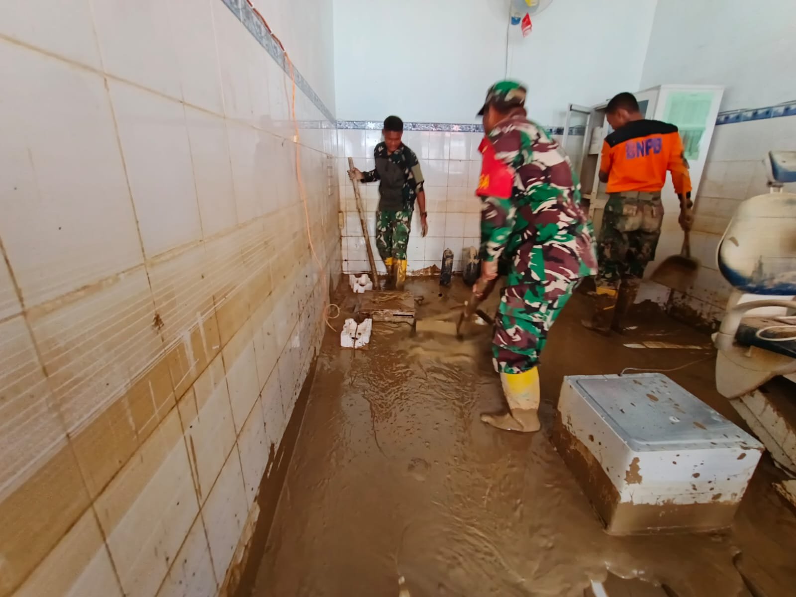 Di lapangan, prajurit TNI bekerja bersama warga mengangkut lumpur, menyiram ruang-ruang kelas menggunakan air bersih, serta merapikan lingkungan sekolah. Endapan lumpur yang menempel di lantai, bangku, hingga dinding kelas dibersihkan secara manual meskipun keterbatasan peralatan masih dirasakan.