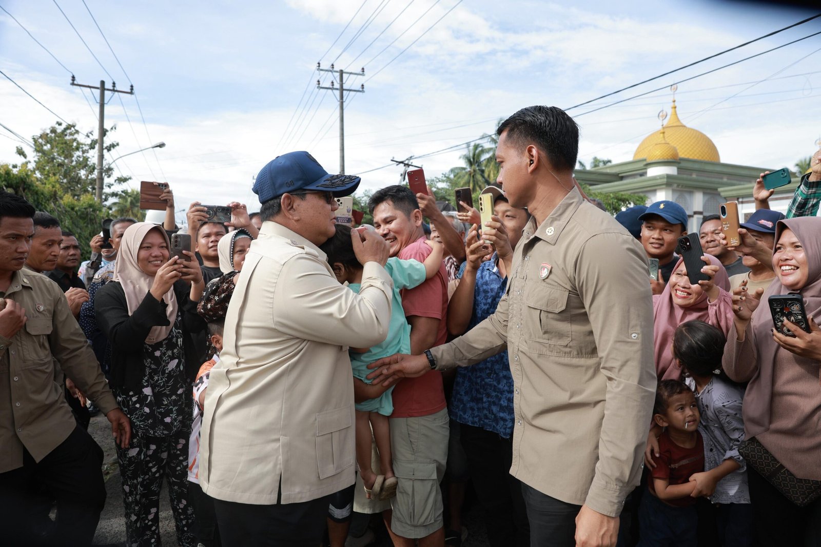 Setelah tiba di helipad PTPN IV, Tapanuli Selatan. Prabowo menghampiri dan menyalami warga serta memeluk anak-anak yang telah menunggu keberangkatannya sejak pagi.