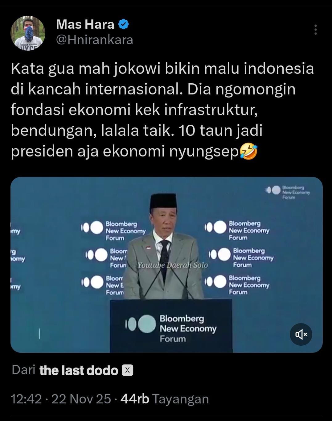 Salah satu warga net dengan akun media sosial X @Hnirankara menuliskan komentar dengan tangkapan foto Jokowi saat pidato di kanal YouTube Bloomberg New Economy Forum, mengatakan bahwa pidato yang dilakukan Jokowi membuat malu Indonesia di kancah Internasional, karena 10 tahun kepemimpinannya jadi presiden RI malah bikin ekonomi nasional turun.